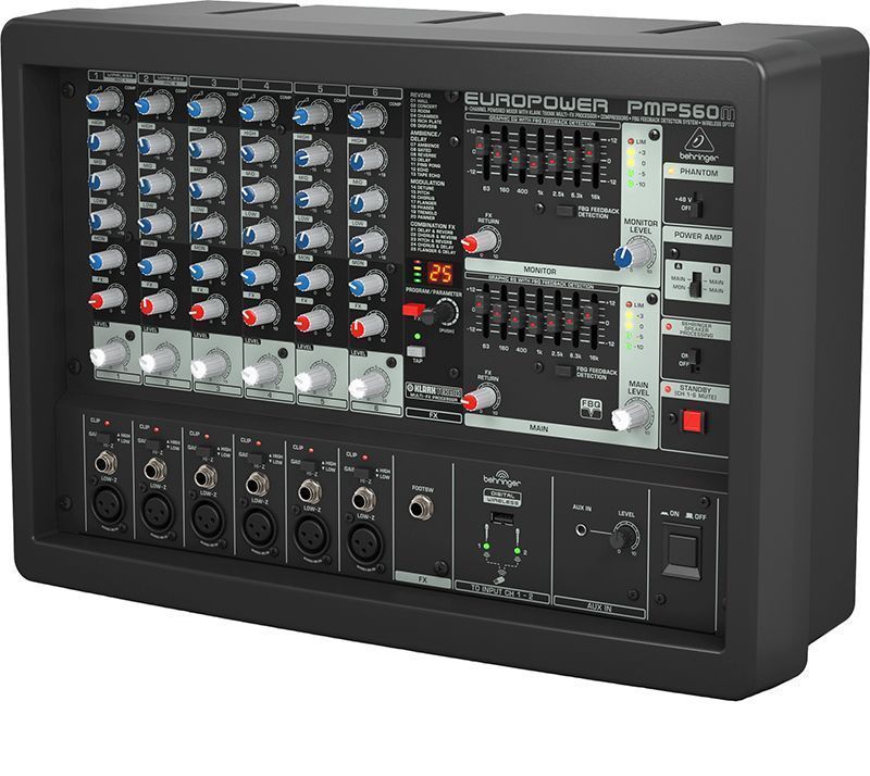 Behringer PMP560M Пульт микшерный (6 моновходов, 6 микрофонных предусилителей) со встроенным усилителем мощности 2х250 Вт/ 4 Ом, эквалайзером, процессором эффектов Klark Technik, порт подключения беспроводного микрофона