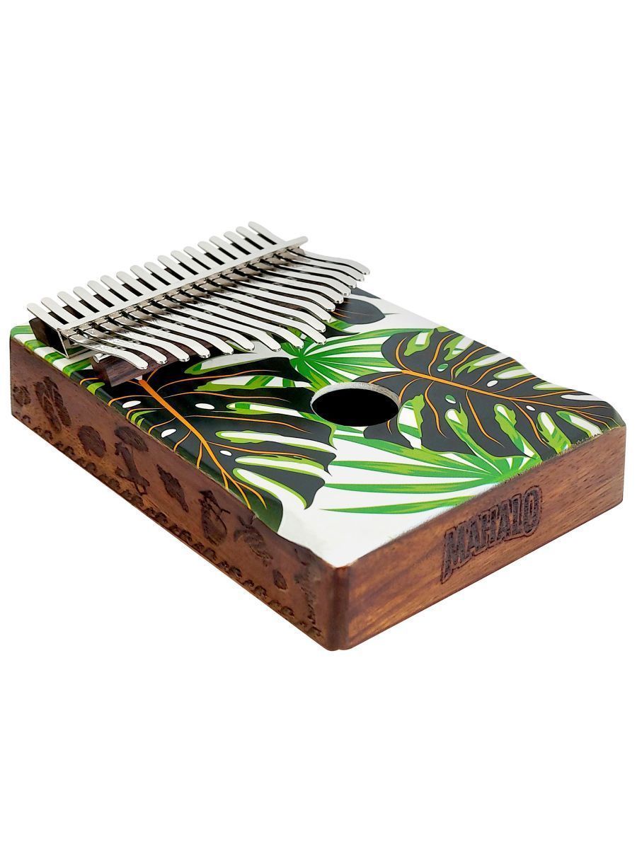 Строй: C Материал: древесина трембези Покрытие: матовое Язычки: 17 Рисунок: графический дизайн Monstera Резонаторное отверстие: круглое Звуковые отверстия: 2 на нижней деке В комплекте: руководство пользователя, молоточек, замшевый чехол