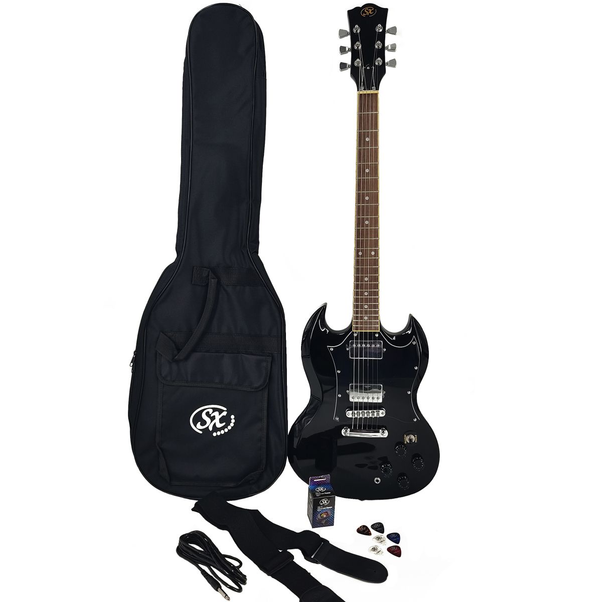 SX SE4-SK-BK – это хороший гитарный комплект, который включает в себя электрогитару, кабель GC-10 10', ремень S40, тюнер SX Roboto X1 Clip-on, 6 медиаторов и чехол EB400/M Gig. Корпус электрогитары выполнен из массива липы. Прочный гриф изготовлен из отборного клена, материал накладки – палисандр. Гитарный комплект SX SE4-SK-BK станет отличным вариантом как для начинающих музыкантов, так и для более опытных исполнителей. Мензура: 625 мм Материал корпуса: массив липы Гриф / накладка грифа: отборный канадский клен / палисандр Анкерный стержень: двухсторонний Лады: 22, никель Электроника: громкость – 2, тон – 2, 3-позиционный переключатель Инкрустации: белые точки Бридж: хром Цвет фурнитуры: хром Цвет корпуса: черный Покрытие: глянцевое В комплекте: кабель GC-10 10', ремень S40, тюнер SX Roboto X1 Clip-on, 6 медиаторов, чехол EB400/M Gig Страна-производитель: Китай ВЕС И ГАБАРИТЫ В УПАКОВКЕ: Вес брутто, кг: 5.3 Длина, см: 103 Ширина, см: 40 Высота, см: 10